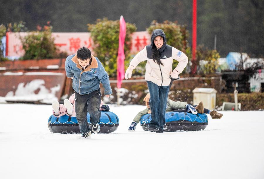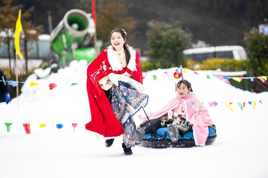 30日、氷雪カーニバルイベントで雪上スポーツを体験する観光客。(重慶=新華社記者/唐奕)