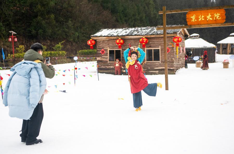30日、氷雪カーニバルイベントでダンス動画を撮影する観光客。(重慶=新華社記者/唐奕)
