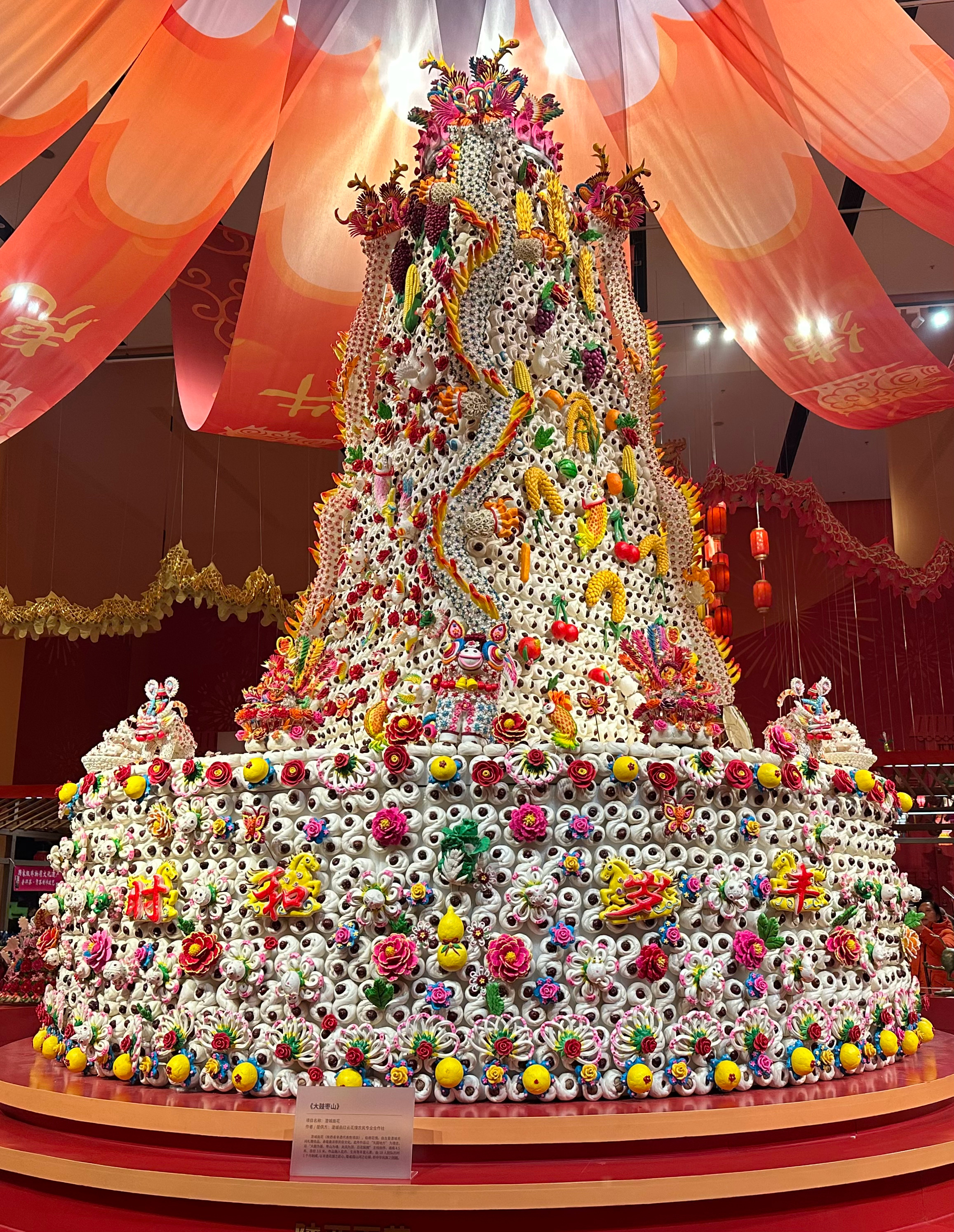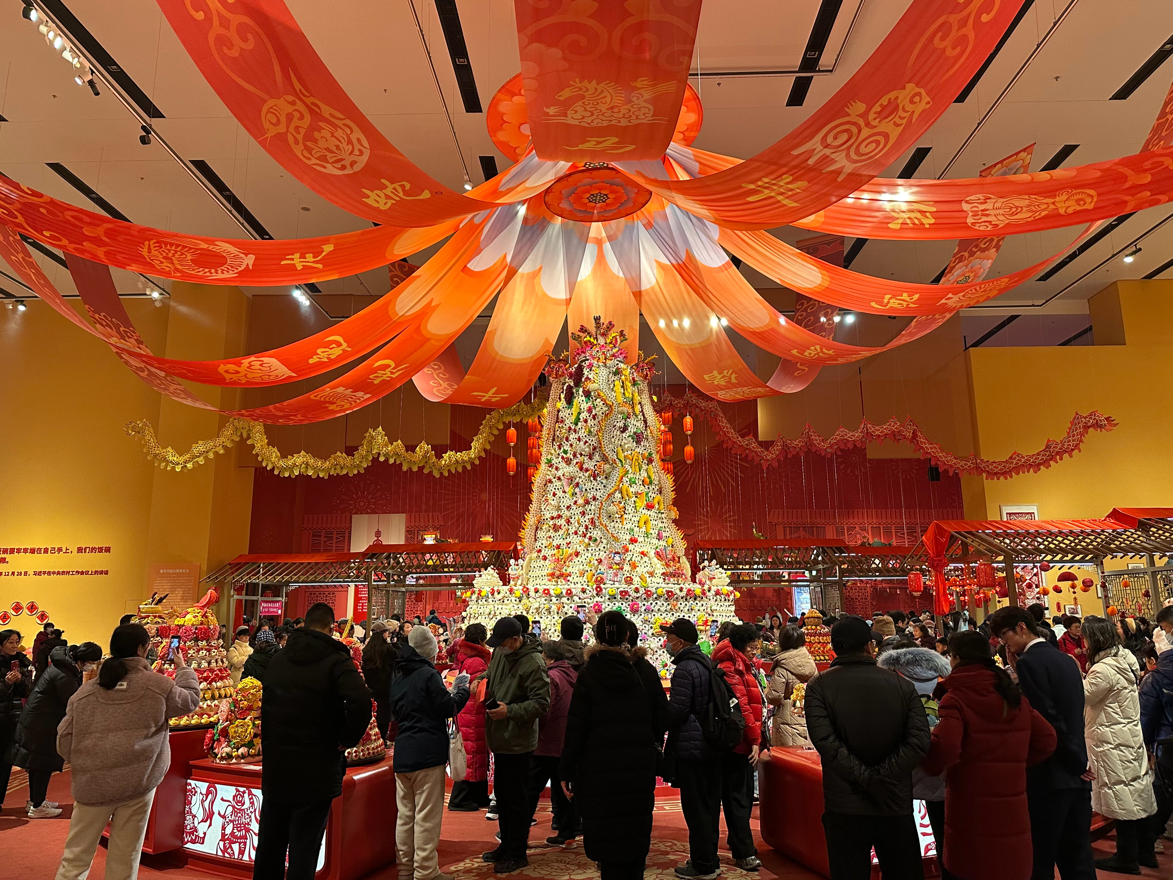 30日、「年越し-丙午春節シリーズテーマ展」で展示された高さ4・5メートル、直径3・6メートルの作品「大鼓棗山」。陝西省の無形文化遺産「澄城面花(飾り蒸しパン)」の技術を使い、18人で1カ月かけて制作した。(北京=新華社記者/陳辰)