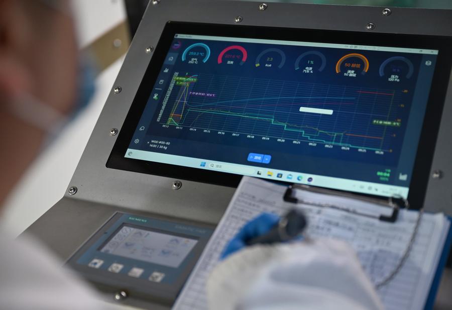 1月27日、中国(濮陽)・エチオピアコーヒー産業モデルパークの焙煎工場でデータを記録する従業員。(鄭州=新華社記者/郝源)