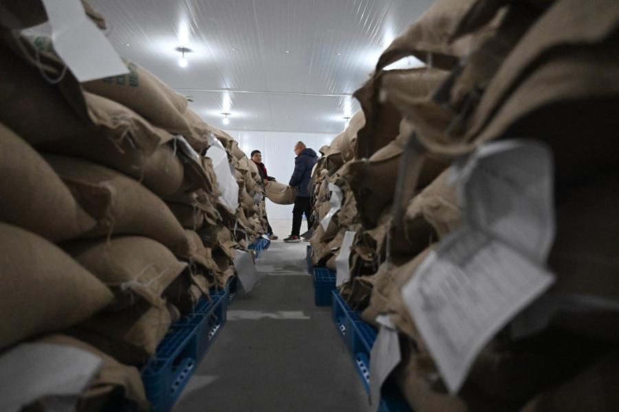 1月27日、中国(濮陽)・エチオピアコーヒー産業モデルパークの原料工場でコーヒー豆を運ぶ従業員。(鄭州=新華社記者/郝源)