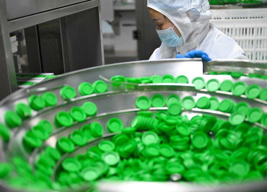1月27日、中国(濮陽)・エチオピアコーヒー産業モデルパークの凍結乾燥工場で、コーヒー液をトレーに入れる従業員。(鄭州=新華社記者/郝源)