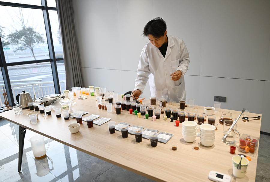 1月27日、中国(濮陽)・エチオピアコーヒー産業モデルパークでカッピング(テイスティング)を行う研究員。(鄭州=新華社記者/郝源)