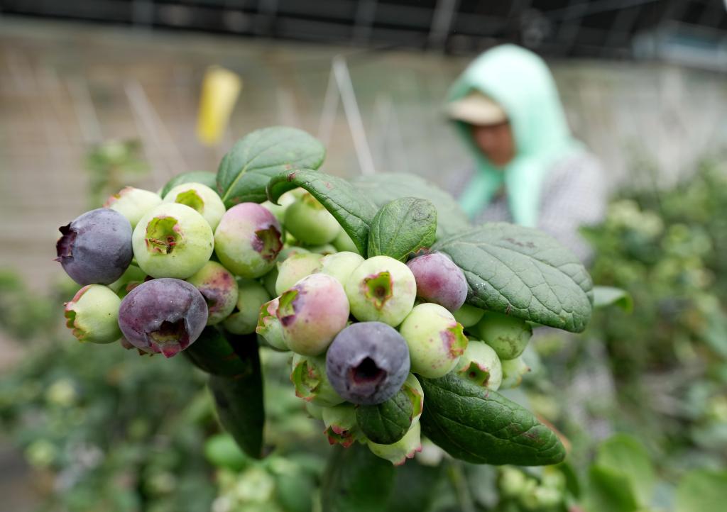 1日、ハウス内でブルーベリーの手入れをする盧竜県のブルーベリー栽培合作社の組合員。(秦皇島=新華社記者/楊世尭)