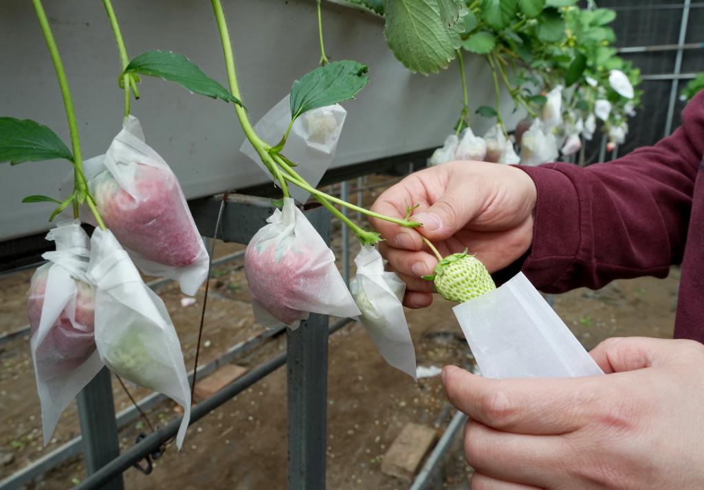 1日、ハウス内でイチゴの袋掛けをする盧竜県のイチゴ栽培合作社の組合員。(秦皇島=新華社記者/楊世尭)