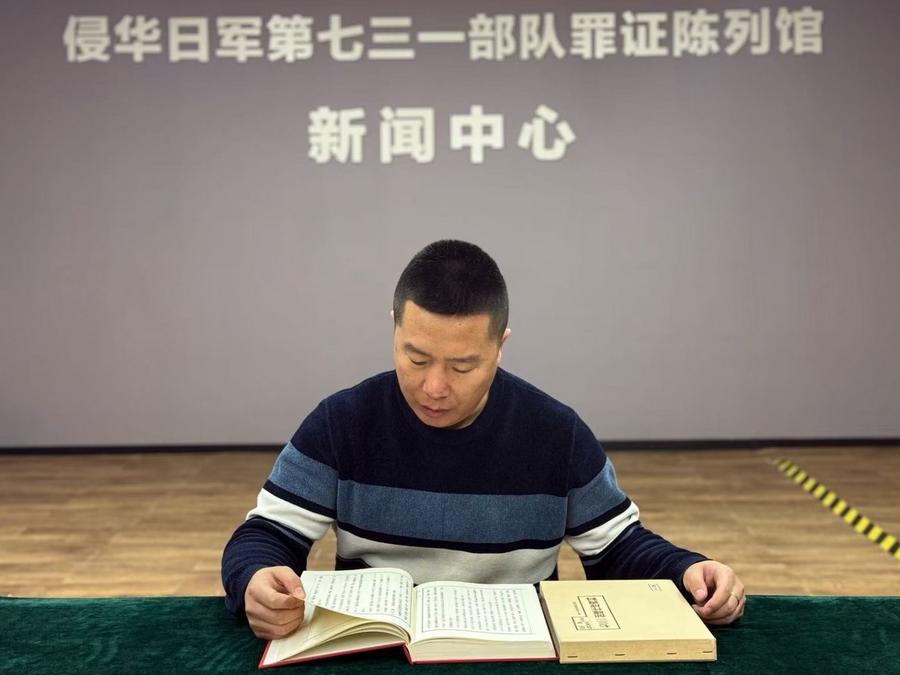 資料を読み解く侵華日軍第七三一部隊罪証陳列館の職員。(ハルビン=新華社配信)