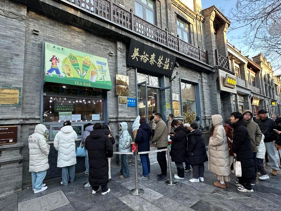 7日、北京の老舗・呉裕泰茶荘の店先で、アイスクリームを買うために並ぶ人々。1887年創業の呉裕泰は、主に茶製品を扱う。(北京=新華社記者/邱虹)