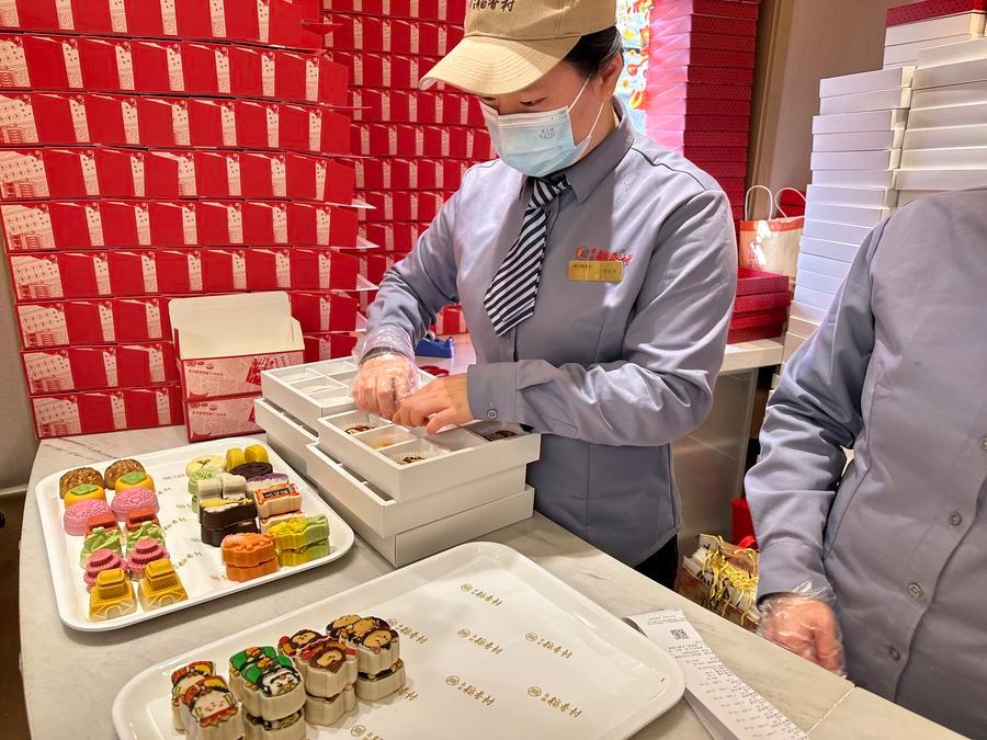 8日、北京稲香村「零号店」で、商品を箱詰めする店員。(北京=新華社記者/邱虹)