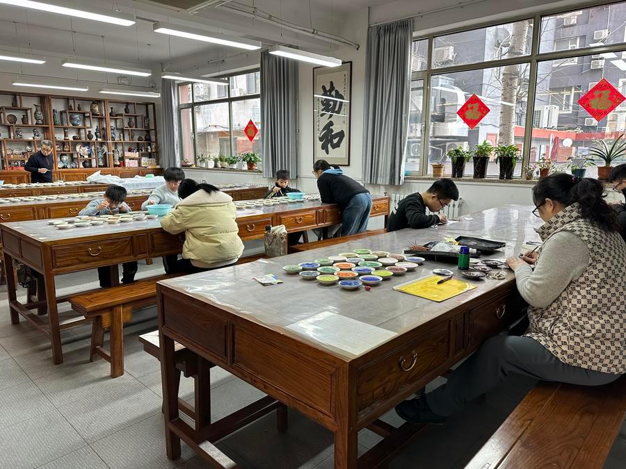 9日、北京市琺瑯廠のインタラクティブ体験エリアで、景泰藍の点藍(てんらん、色付け)技法を体験する人々。(北京=新華社記者/邱虹)