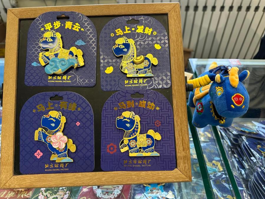 9日、北京市琺瑯廠で販売されている午(うま)年を記念する文化クリエーティブ製品。1956年設立の北京市琺瑯廠は、全国の景泰藍(けいたいらん、七宝焼)業界で唯一「中華老字号」(中国老舗企業)の認定を受けている。(北京=新華社記者/邱虹)