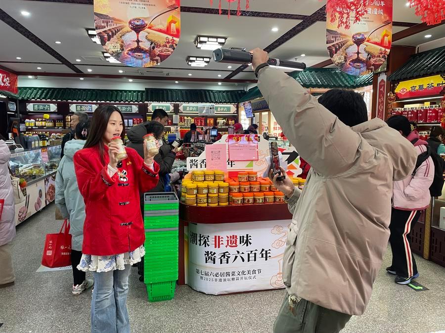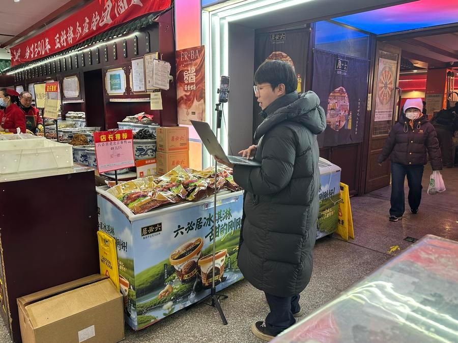 7日、前門にある六必居本店の店内で、ライブ配信を通じて商品を販売するスタッフ。(北京=新華社記者/邱虹)