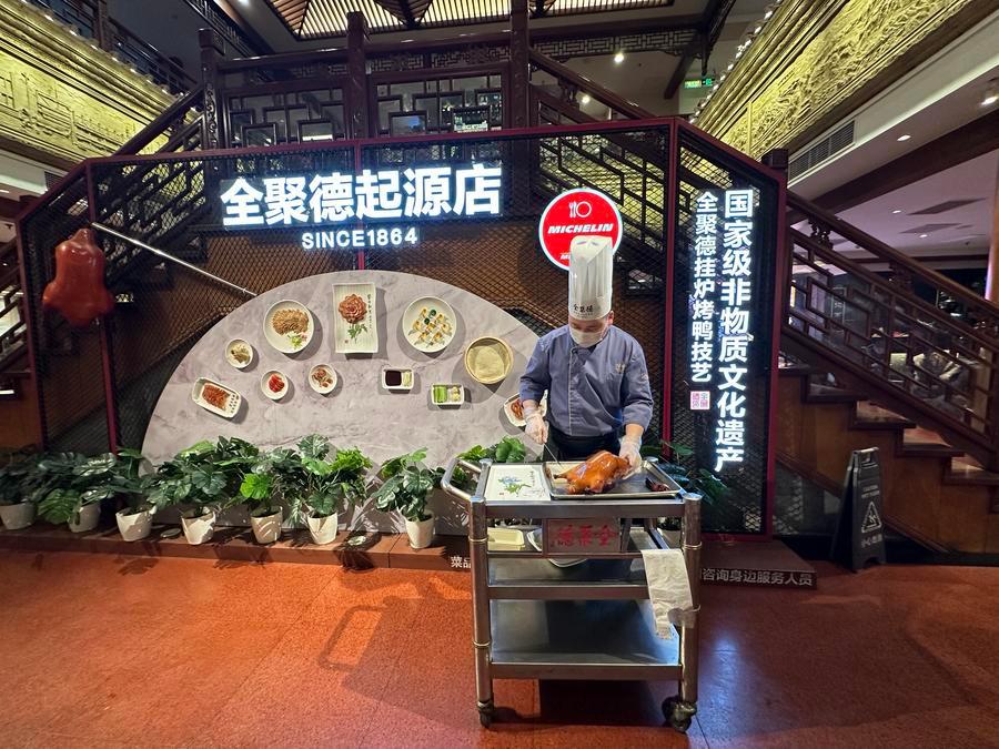 7日、北京市の前門大街にある全聚徳の創業店で、お客に北京ダックを切り分ける料理人。(北京=新華社記者/邱虹)