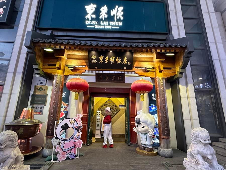 7日、北京の老舗・東来順の店先で記念撮影をする観光客。涮羊肉(羊肉のしゃぶしゃぶ)で知られる東来順は1903年創業。(北京=新華社記者/邱虹)