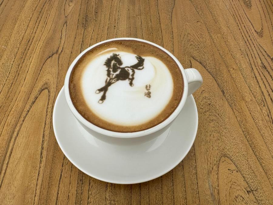 8日、「文房四宝」や書画骨董の老舗として知られる栄宝斎で提供している、徐悲鴻(じょ・ひこう)の作品「奔馬」をモチーフにしたラテアート。(北京=新華社記者/邱虹)