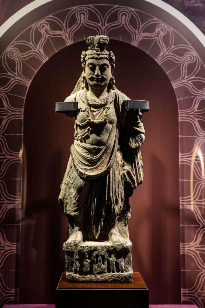 天津博物館「芳香妙相-南京大報恩寺遺跡博物館蔵ガンダーラ造像展」に展示された弥勒菩薩立像。(南京大報恩寺遺跡博物館蔵、天津=新華社配信)