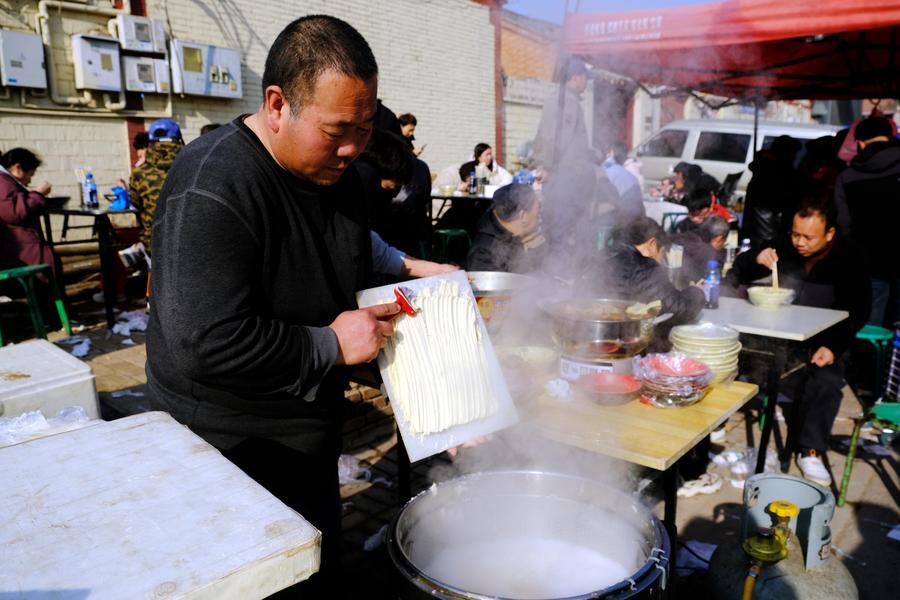 12日、太子務大集で麺を作る業者。(天津=新華社配信/于長華)