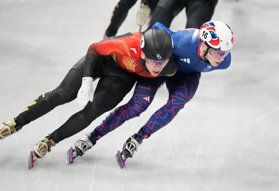 14日、ミラノ・コルティナ冬季五輪スピードスケートのショートトラック男子1500メートル決勝に臨む中国の劉少昂(りゅう・しょうこう、左)と英国のナイル・トレーシー。(ミラノ=新華社記者/薛宇舸)