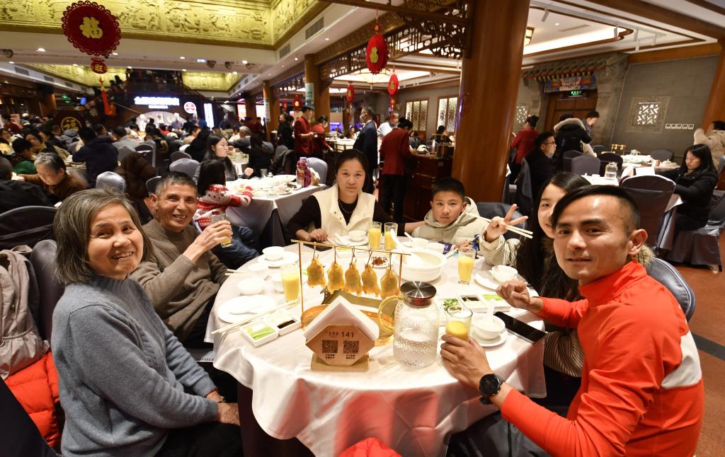 16日、北京市前門歩行街にある北京ダックの老舗「全聚徳」で、年夜飯を味わう浙江省寧波市の観光客。 (北京=新華社記者/李欣)