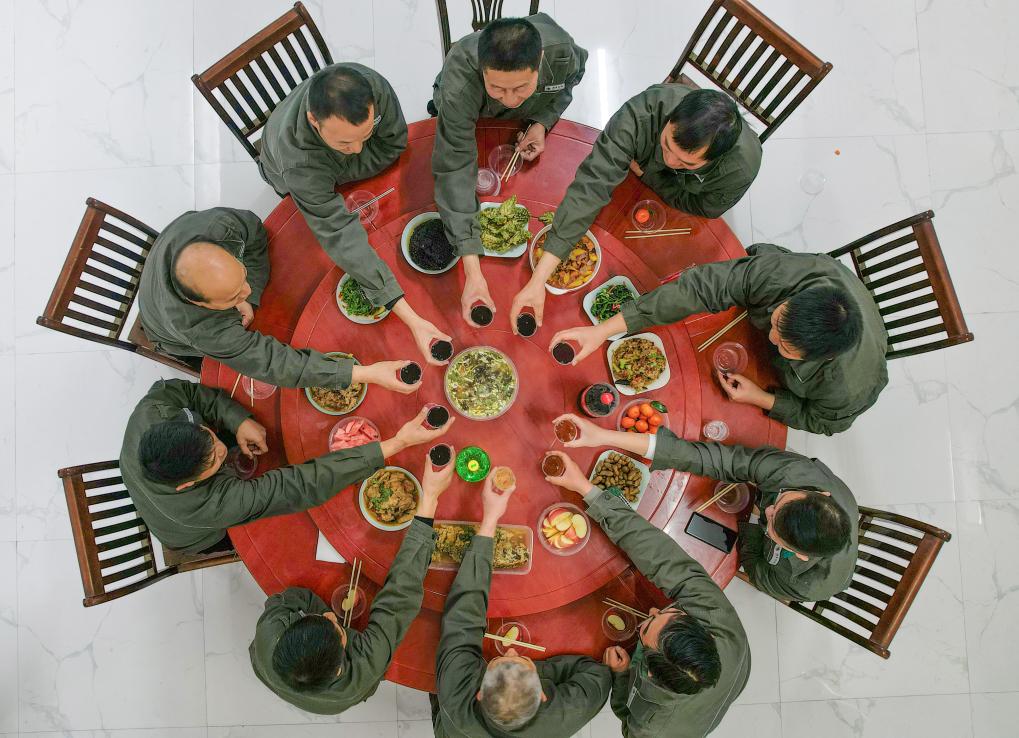 16日、河南省商丘市の電力供給会社、国網河南省電力商丘供電の会亭供電所の食堂で、年夜飯を囲む保守作業員たち。(ドローンから、商丘=新華社配信/王高超)