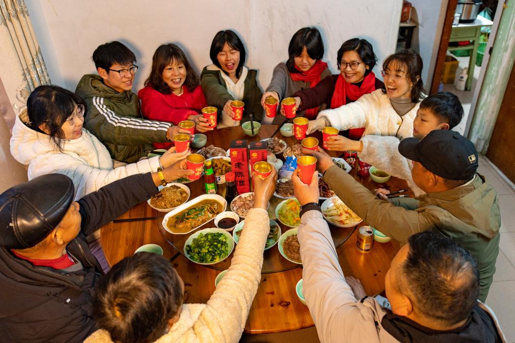 16日、浙江省台州市仙居県安洲街道で、年夜飯を囲む家族。(台州=新華社配信/王華斌)