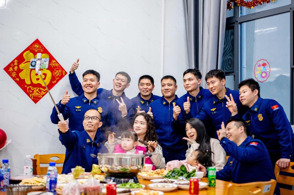 16日、江蘇省泰興市の澄江西路消防救援署で、家族と年夜飯を囲む消防士たち。(泰興=新華社配信/楊玉崗)
