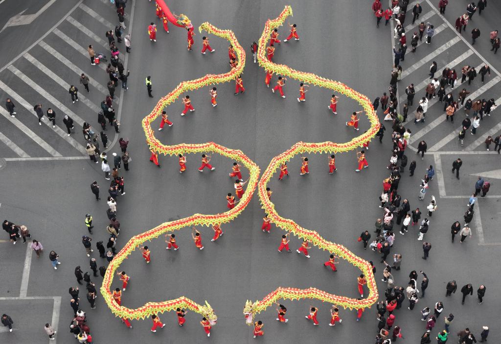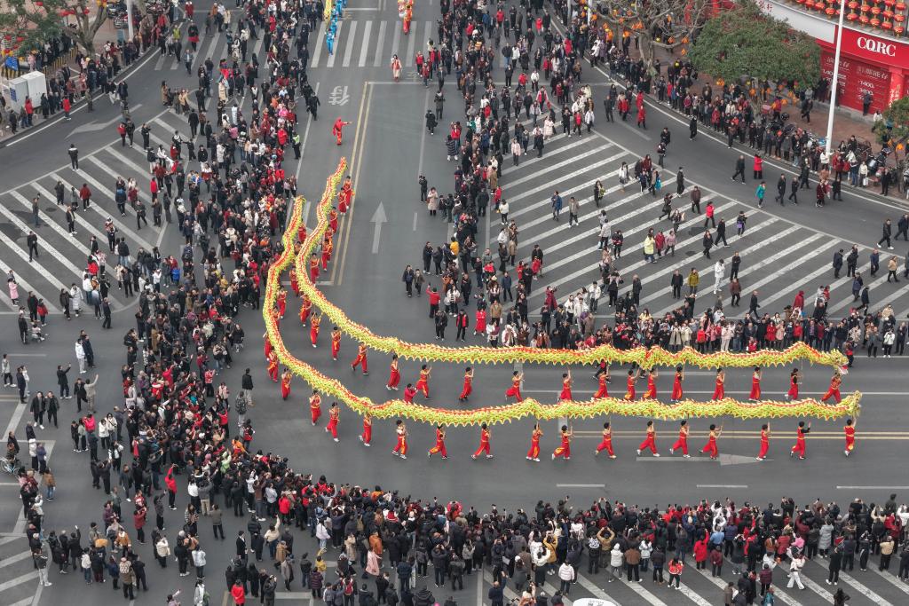 【新華社重慶2月18日】中国重慶市銅梁区で旧暦元日の17日、春節(旧正月)を祝う竜舞のパレードが開幕した。全国各地から12種類、60余りの竜舞チームが集まり、合同で演舞を披露した。催しは正月十五(3月3日)まで続く。
