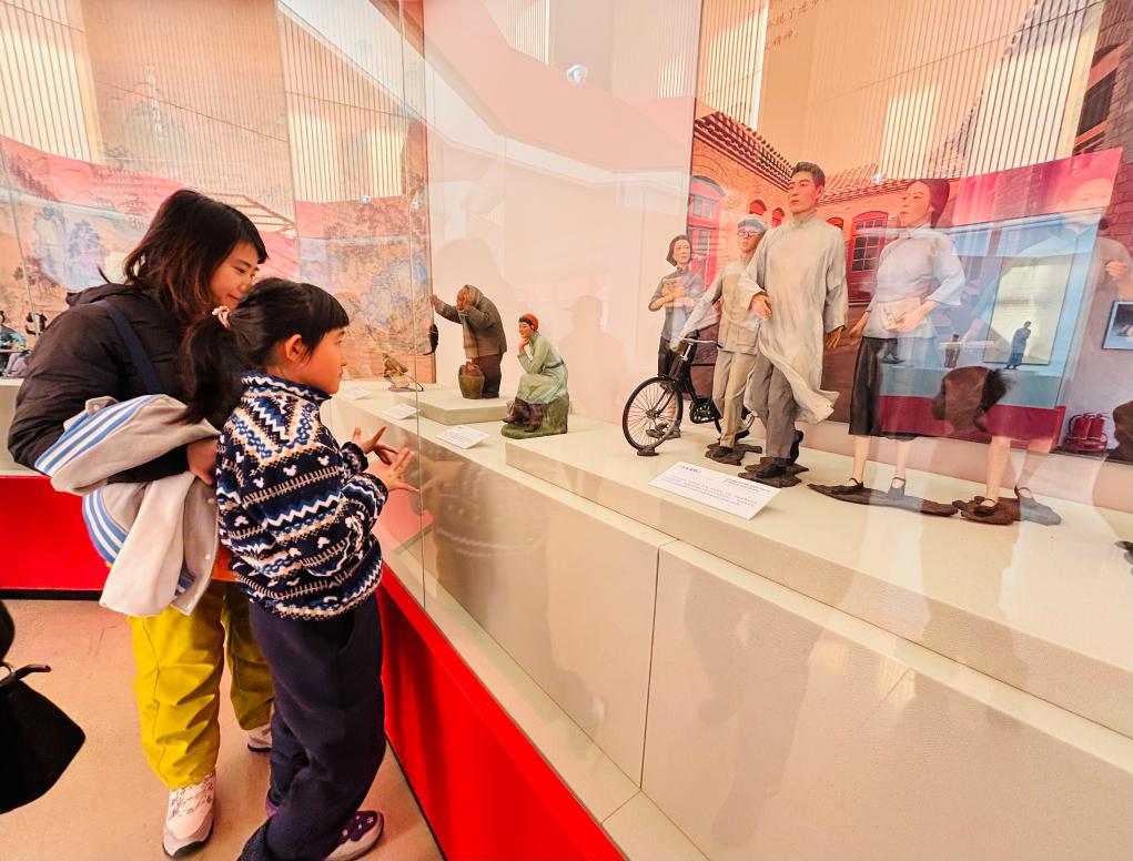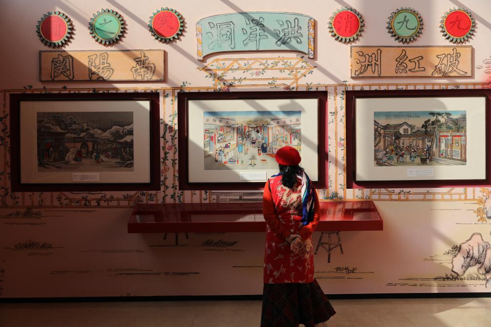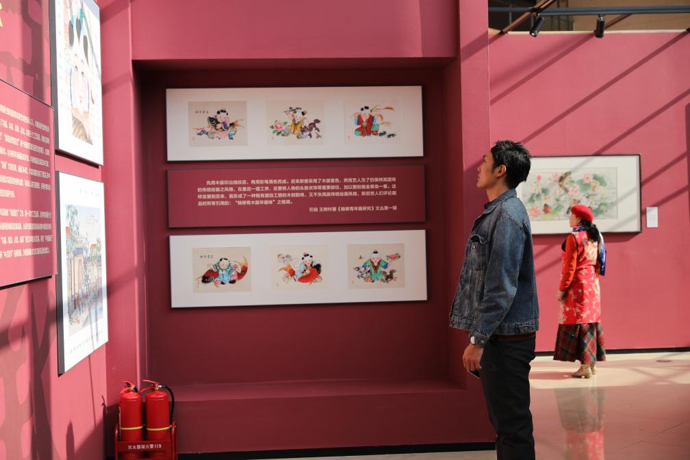 13日、天津博物館「「天津芸術の粋、色彩と造形に宿る魂-楊柳青年画・泥人張彩塑芸術展」で展示を見る人。(天津=新華社記者/周潤健)