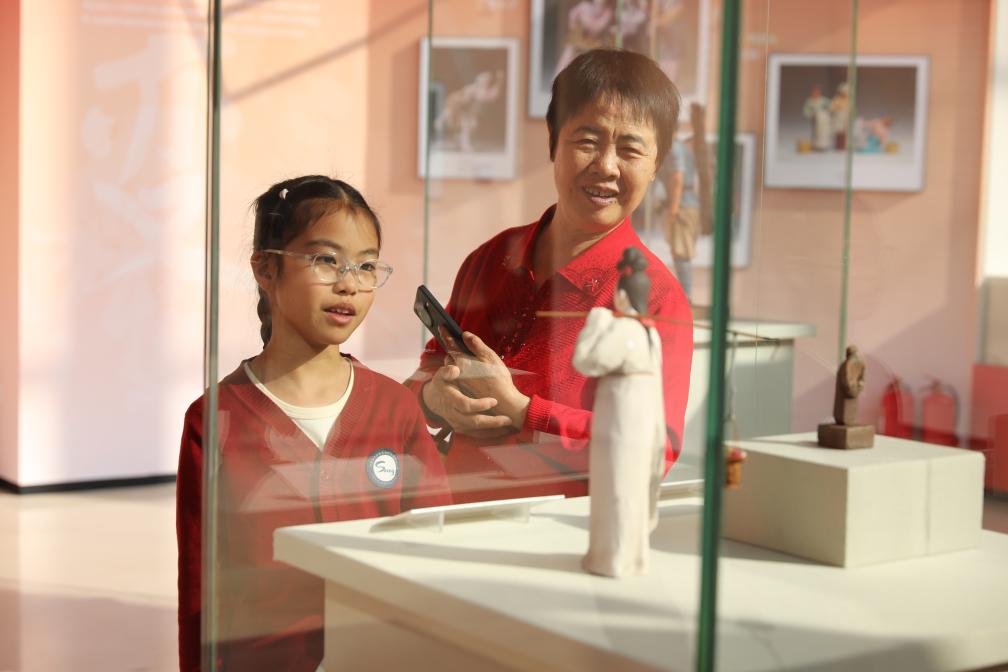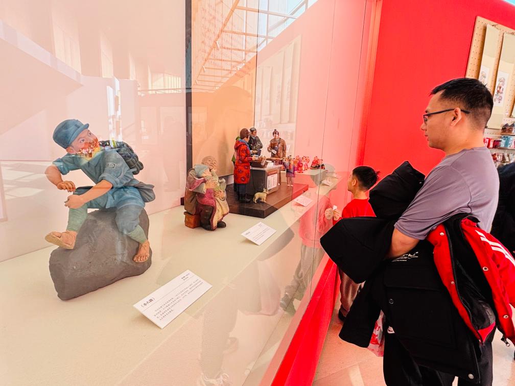 13日、天津博物館「「天津芸術の粋、色彩と造形に宿る魂-楊柳青年画・泥人張彩塑芸術展」に展示された泥人張彩塑の作品。(天津=新華社記者/周潤健)