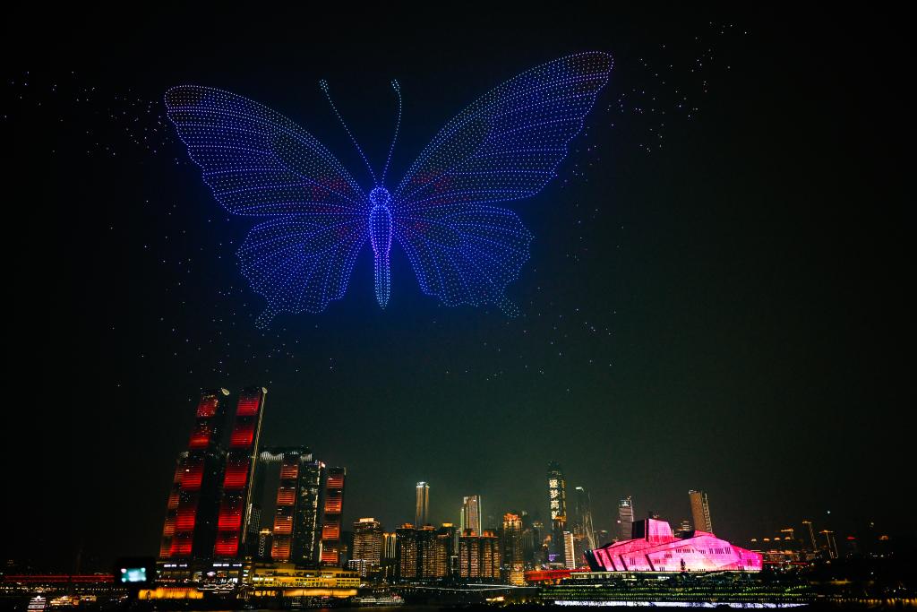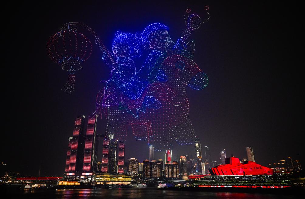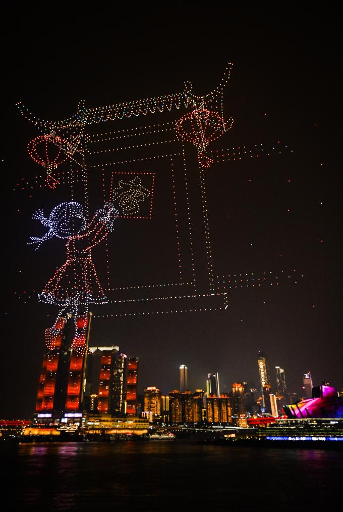 【新華社重慶2月18日】中国重慶市で旧暦元日の17日、ドローンによるライトショーが行われた。編隊を組んだ機体がさまざまな図柄を描き、夜空を鮮やかに彩った。