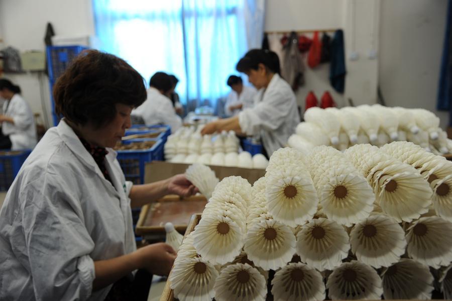 安徽省六安のスポーツ用品メーカーで、バドミントン用シャトルの製造に取り組む従業員。(六安=新華社配信)