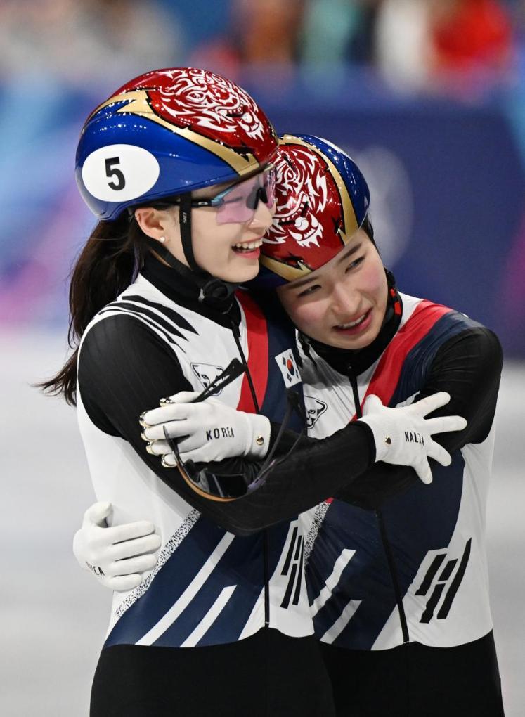 20日、決勝を終え健闘を称え合う韓国のキム・ギルリ(右)と崔珉禎(チェ・ミンジョン)。(ミラノ=新華社記者/程敏)