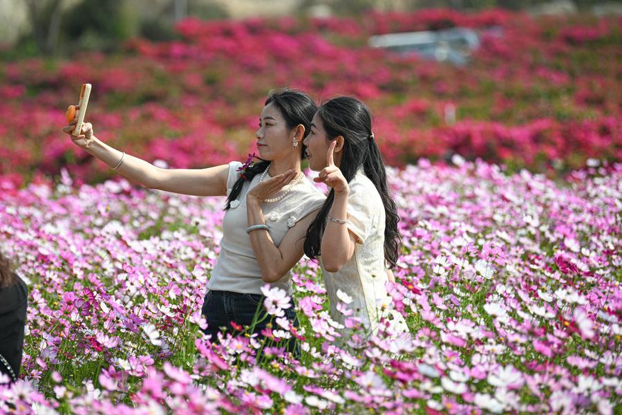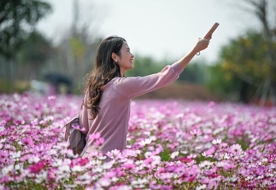 20日、海南省昌江リー族自治県の聚源花卉博覧園でコスモス畑を撮影する観光客。(昌江=新華社記者/蒲暁旭)