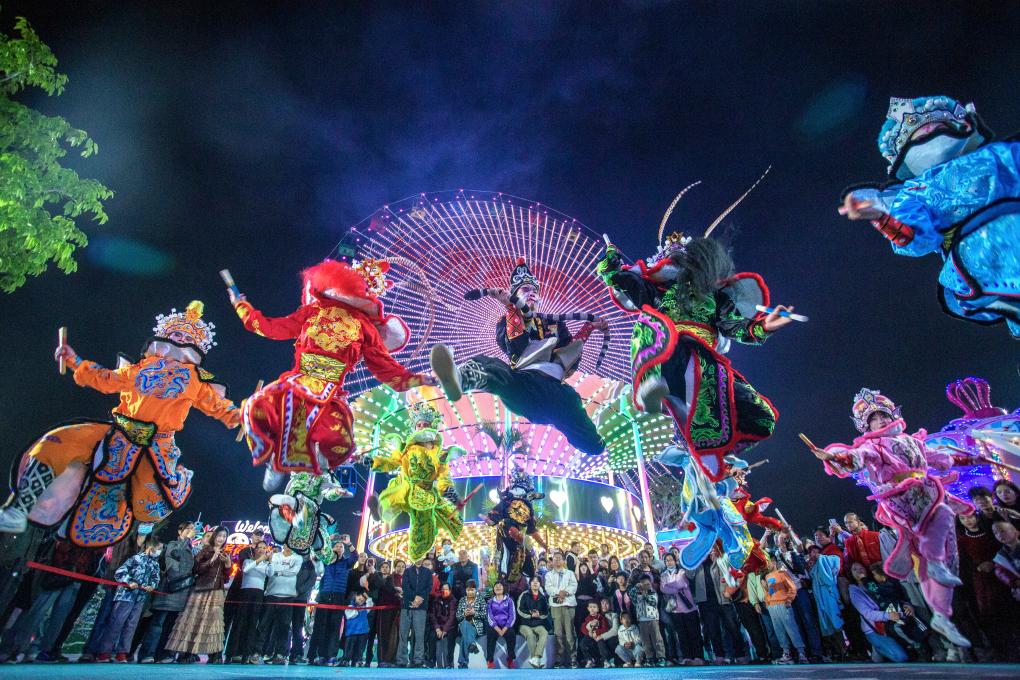 19日、河南省商丘市の古城風景区で、四川省の伝統劇「川劇」の変臉(へんれん=隈取りの仮面の早変わり)を披露する出演者。(商丘=新華社記者/朱祥)