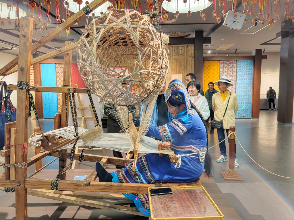 広西民族博物館で、織物技術に関する展示を見る人たち。(2月18日撮影、南寧=新華社記者/黄慶剛)
