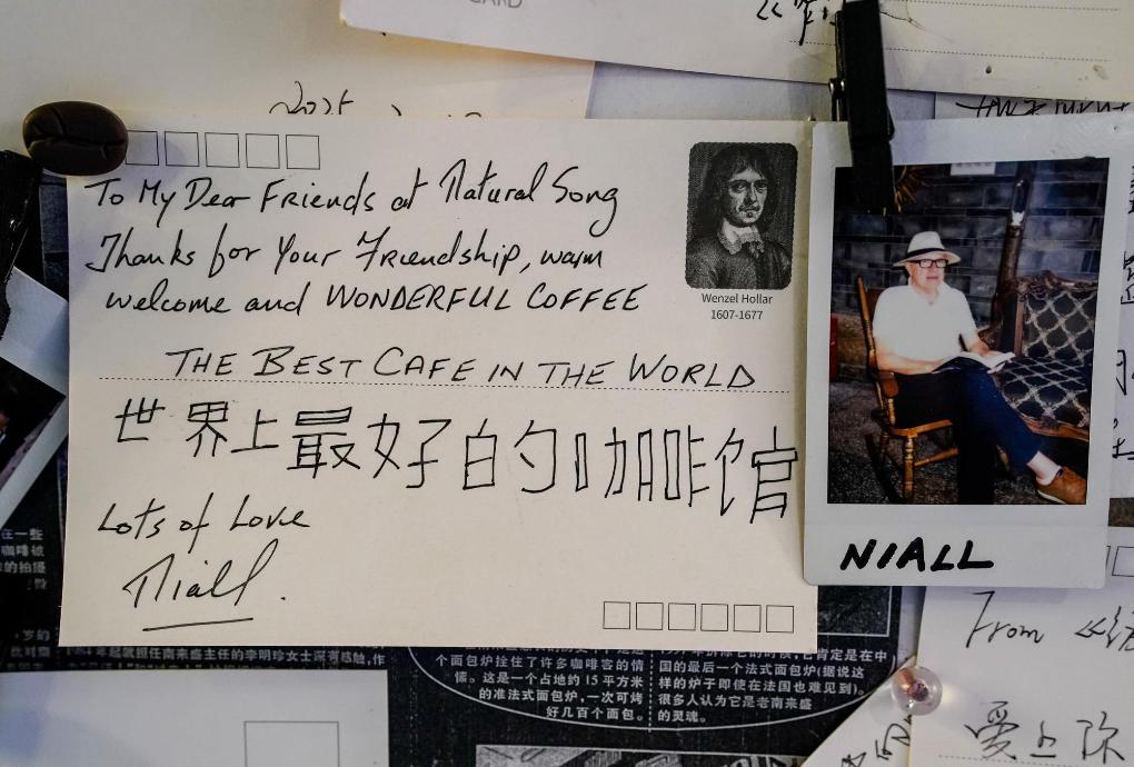 昆明市の翠湖公園近くのカフェで、英国人観光客が思いを記したポストカード。(資料写真、昆明=新華社記者/彭奕凱)