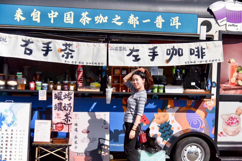 昆明市のコーヒーマーケットで、「左手にコーヒー、右手にお茶」と書かれたコーヒーの移動販売車の前で写真を撮る市民。(資料写真、昆明=新華社記者/王賢思)