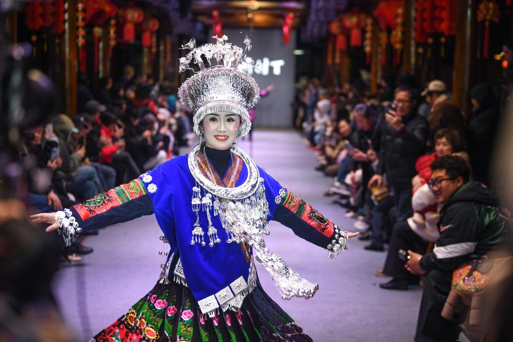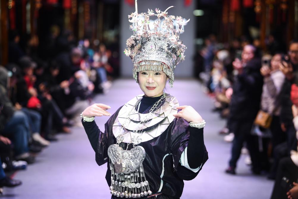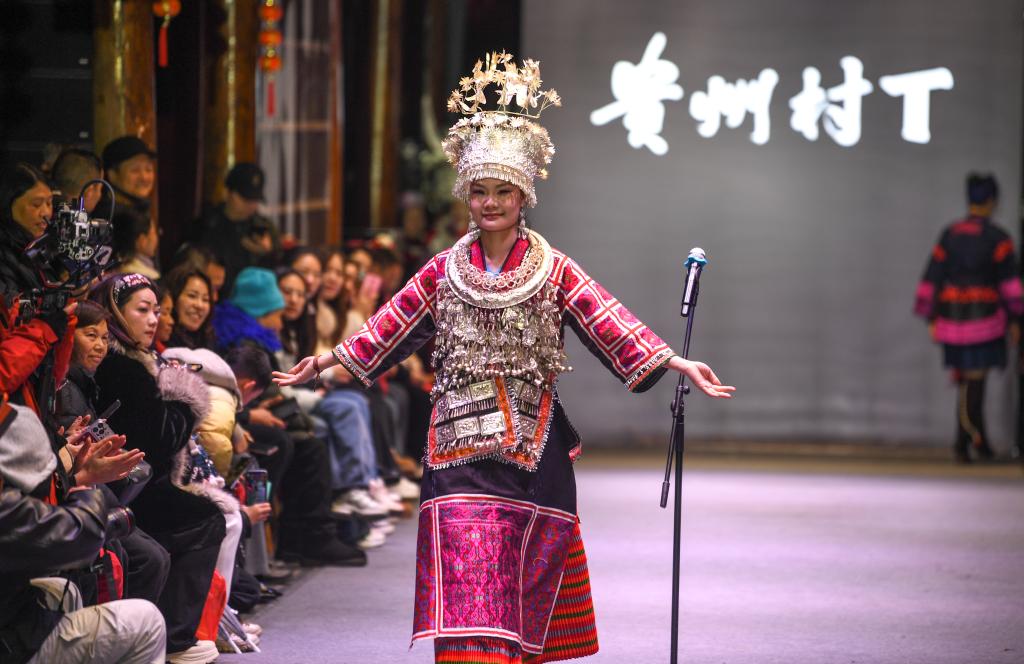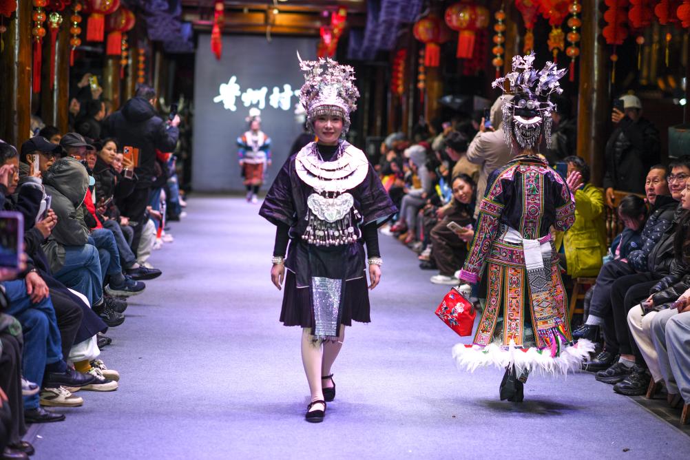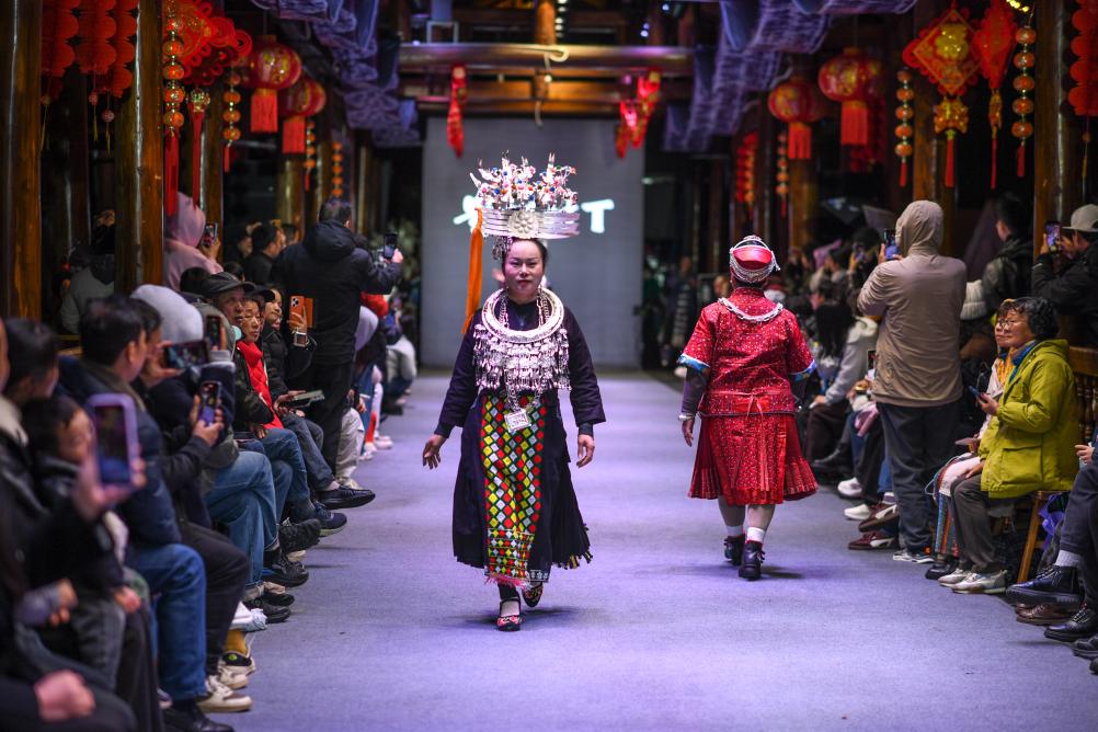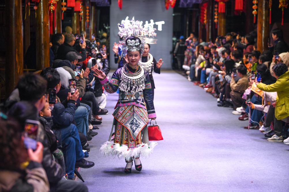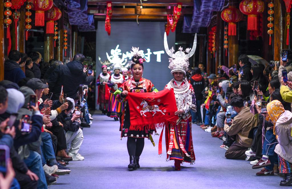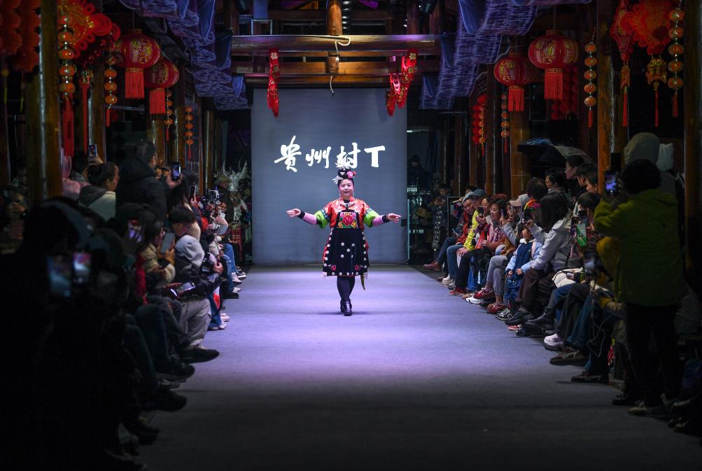【新華社凱里3月11日】中国貴州省黔東南(けんとうなん)ミャオ族トン族自治州凱里市の「苗(ミャオ)侗(トン)風情園」で8日、民族衣装のファッションショー「村T」が開かれた。自治州内16の県・市の女性代表がランウェイを歩き、民族衣装の多彩な美しさを披露した。