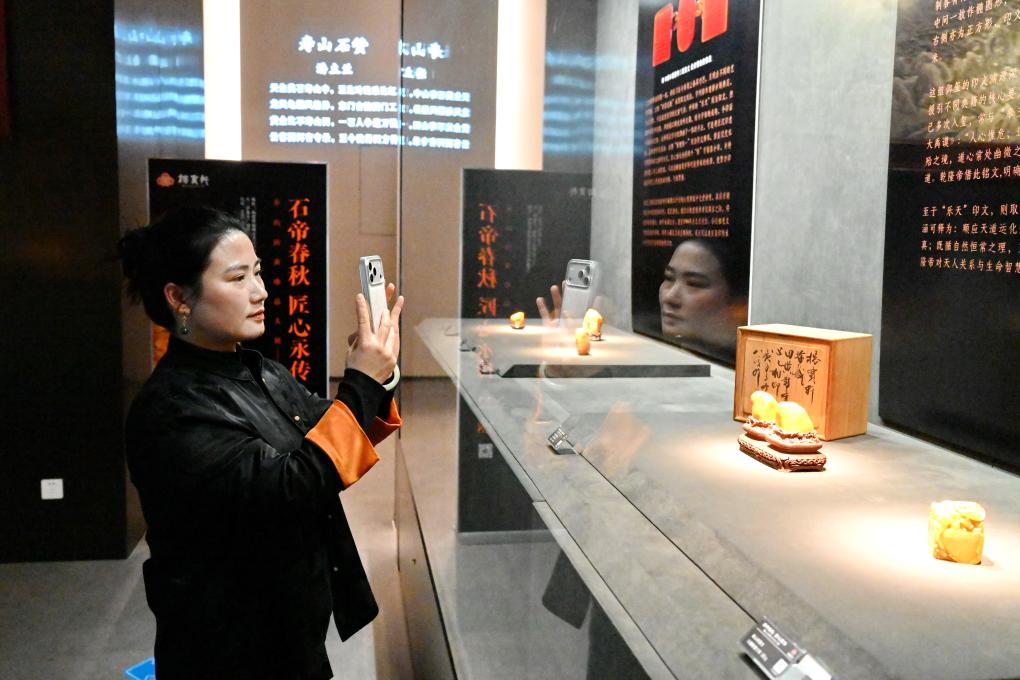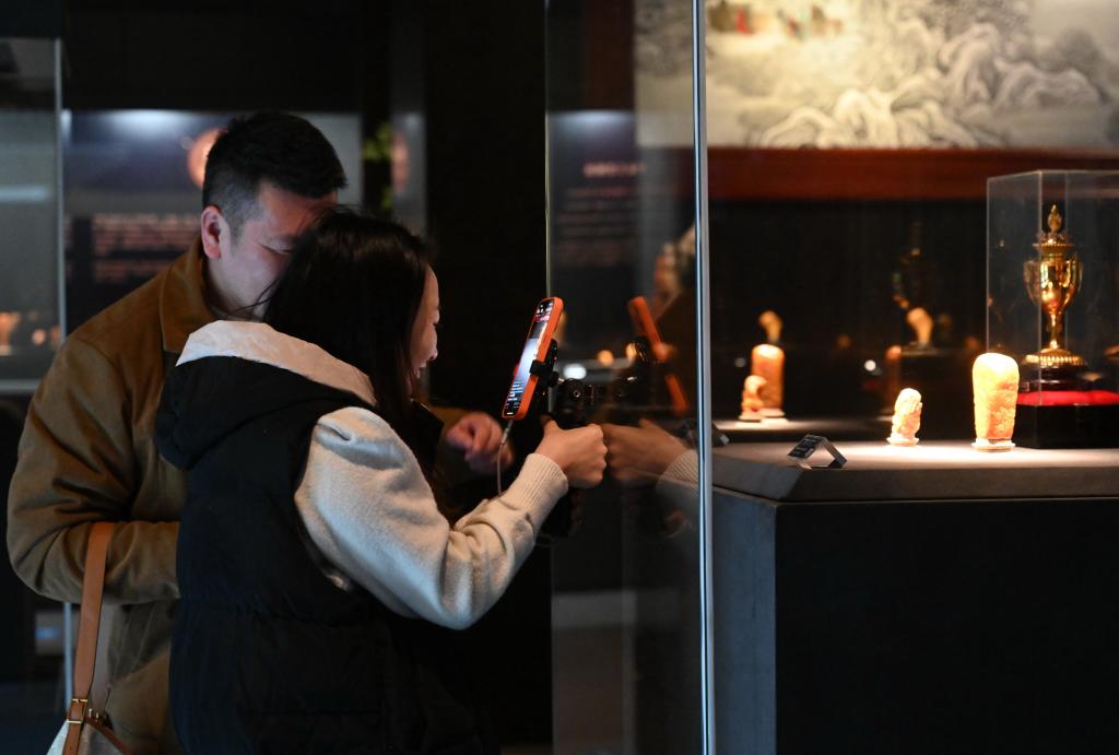 8日、榕宝軒芸術館で、田黄石の作品を撮影する人。(福州=新華社記者/林善伝)