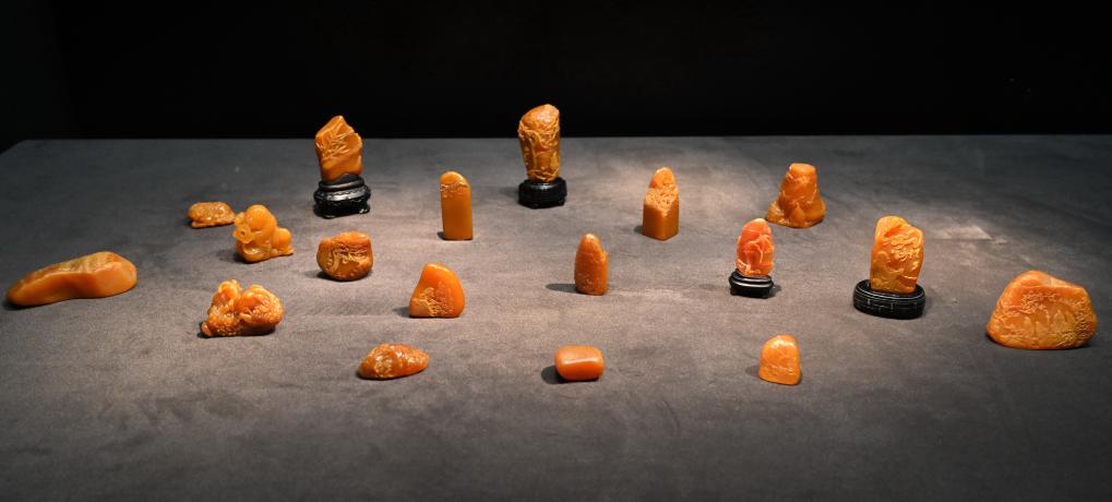8日、榕宝軒芸術館で展示された田黄石の作品。(福州=新華社記者/林善伝)