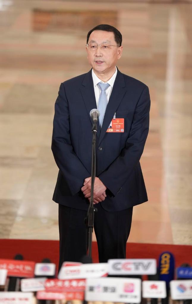 12日、「部長通路」で取材を受ける関志鴎自然資源部長。(北京=新華社記者/李鑫)