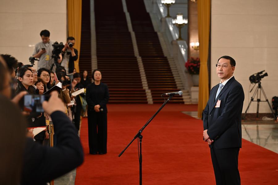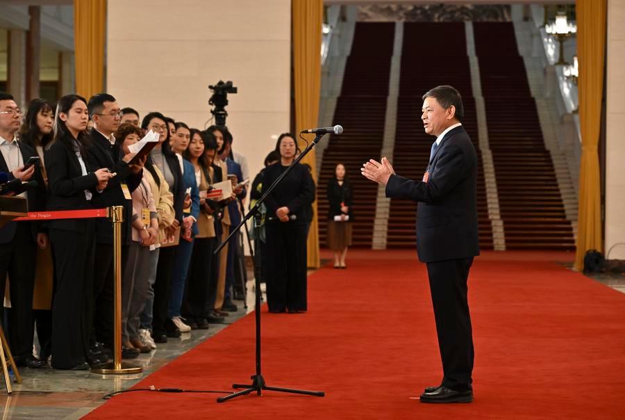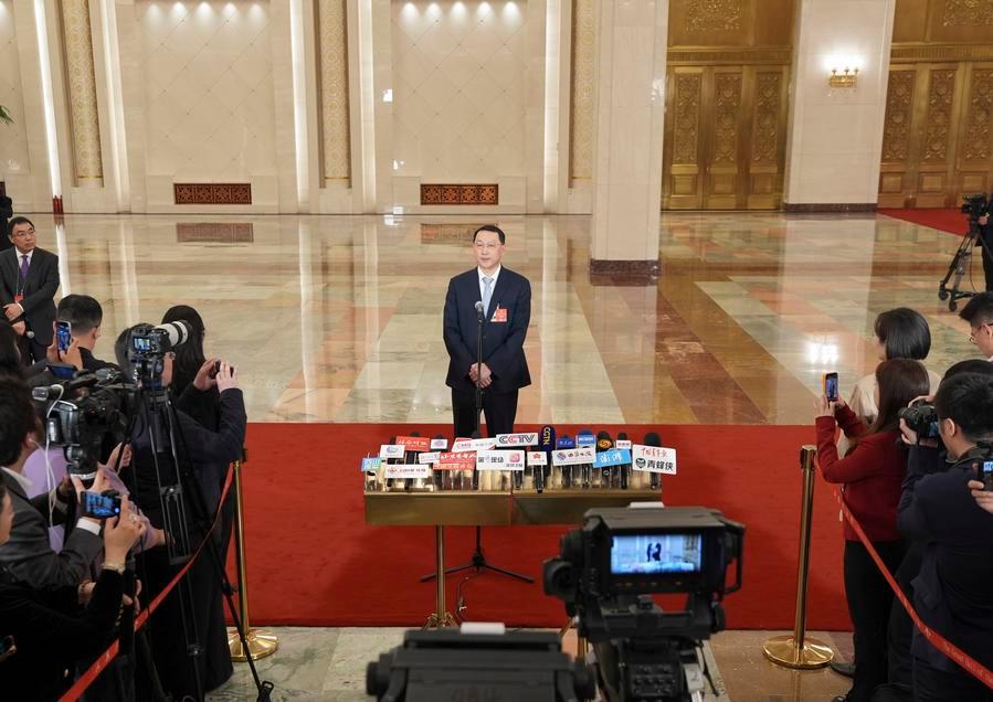 12日、「部長通路」で取材を受ける賀栄司法部長。(北京=新華社記者/金立旺)
