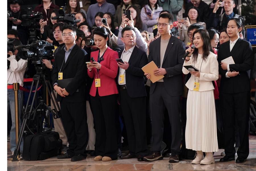12日、「代表通路」で取材する記者ら。(北京=新華社記者/傅天)