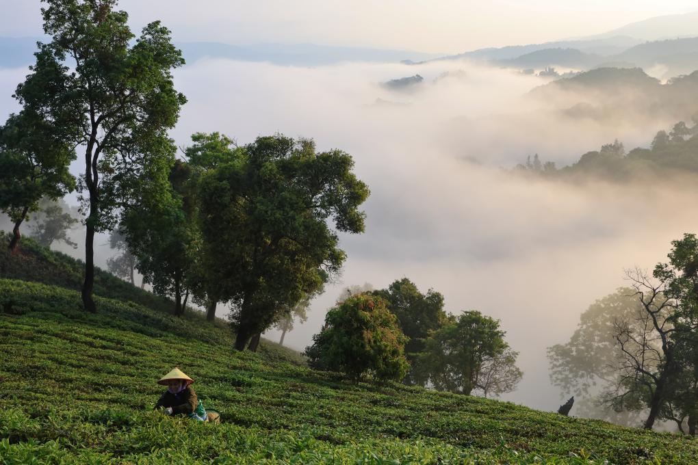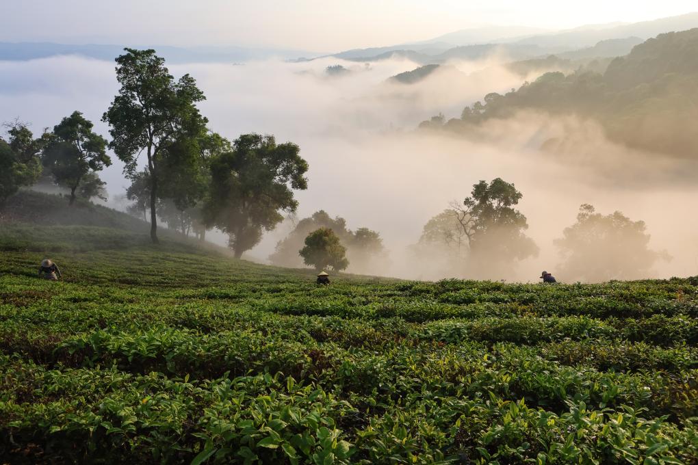 15日、雲南省西双版納(シーサンパンナ)ダイ族自治州勐海(もうかい)県勐混鎮で茶摘みをする人たち。(勐海=新華社配信/李雲生)