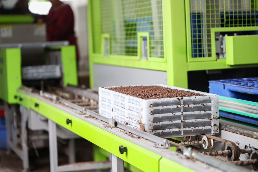 27日、フル稼働する重慶陶義農業機械合作社の水稲全自動育苗ライン。(重慶=新華社記者/黄偉)