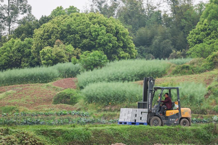 27日、重慶市永川区の二郎壩村で、発芽促進後の育苗パレットをフォークリフトで育苗田へ運ぶ地元住民。(重慶=新華社記者/黄偉)