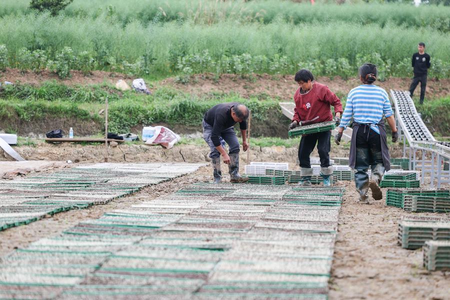 27日、重慶市永川区の二郎壩村で、発芽促進後の育苗パレットを搬送ラインから育苗田へ運ぶ村民。(重慶=新華社記者/黄偉)