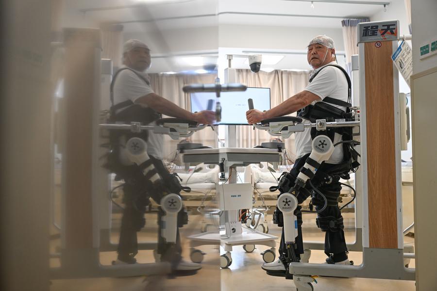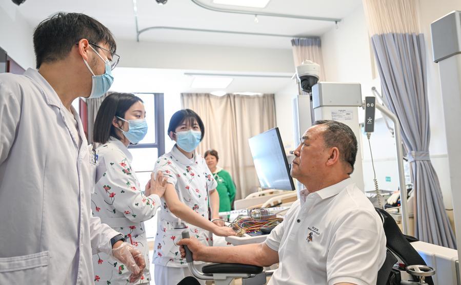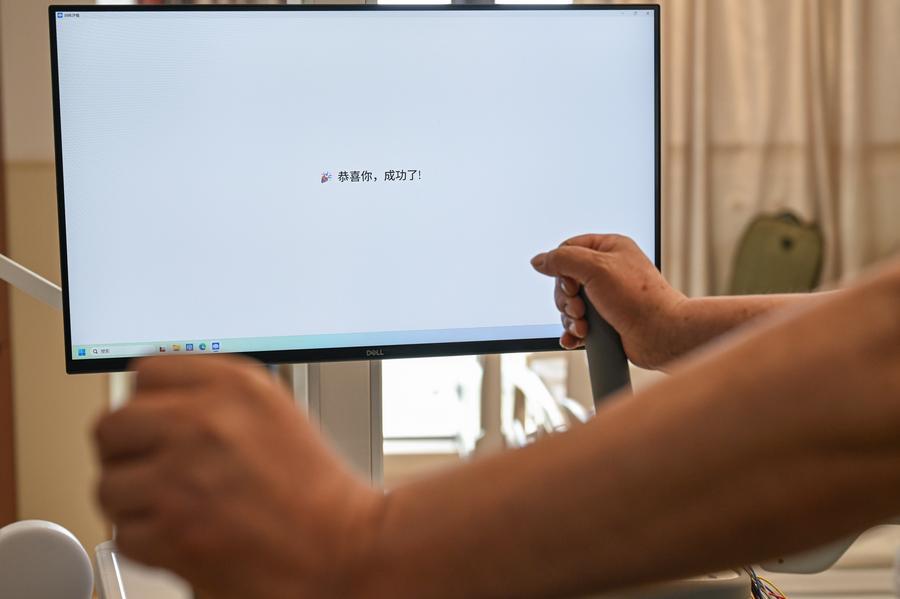 【新華社重慶4月14日】中国重慶市の重慶医科大学付属第2病院で、ブレーン・コンピューター・インターフェース(BCI)を用いたリハビリの臨床研究が進められている。脳梗塞で左脚にまひが残る72歳の患者は非侵襲型のBCI装置を装着し、医療スタッフの指導のもと、動かすイメージを描くことでまひした脚を動かす訓練に取り組んだ。