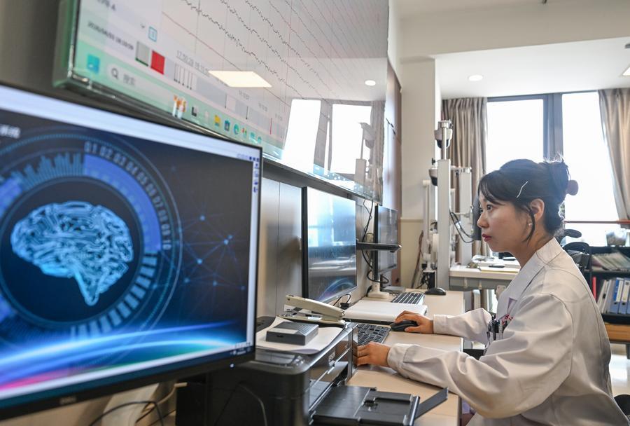 10日、重慶医科大学付属第2病院で、患者の脳波データをパソコンで確認する医師。(重慶=新華社記者/陳誠)