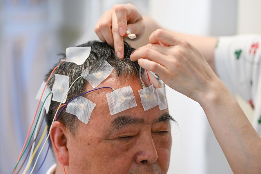 10日、重慶医科大学付属第2病院で、脳梗塞患者に非侵襲型BCI装置を装着する医療スタッフ。(重慶=新華社記者/陳誠)