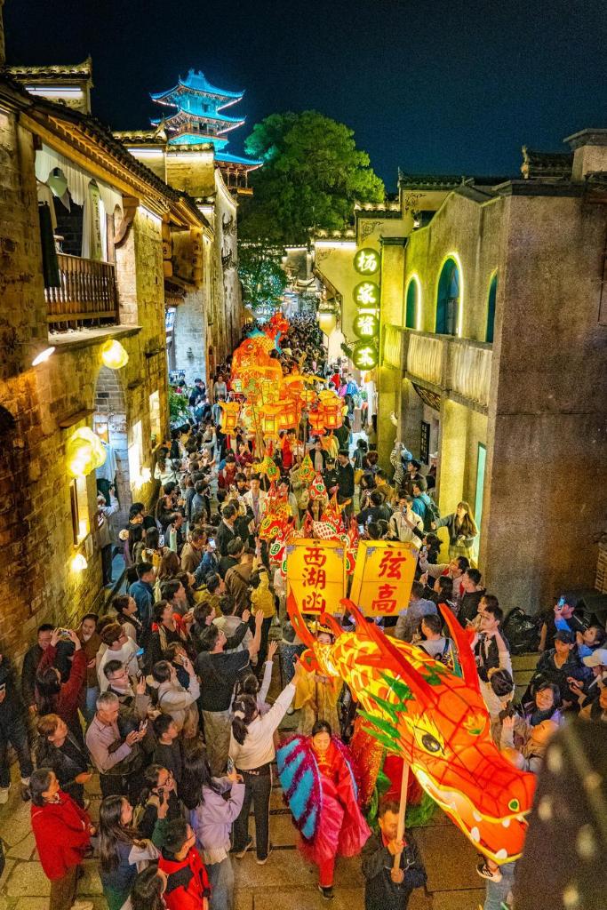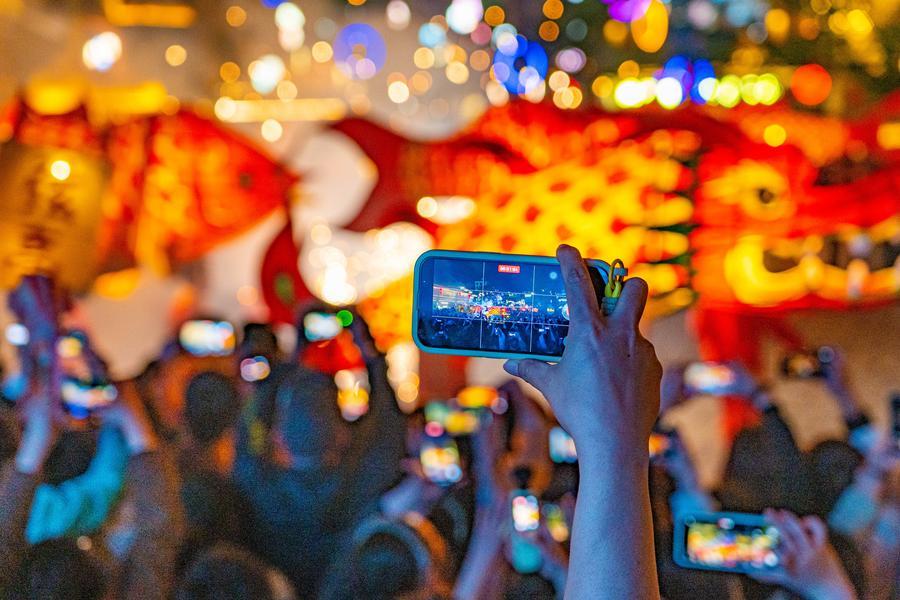 4日、弦高古城内で行われる無形文化遺産「魚灯」のパレードを撮影する観光客。(婺源=新華社配信)